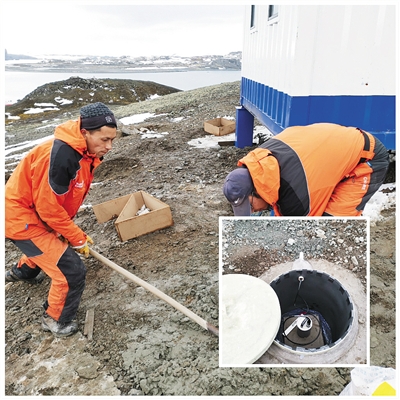 科考队员挖掘观测仪器安放坑。小图为南极地震台站观测仪器安放坑。图片由中国地震局地球物理研究所提供