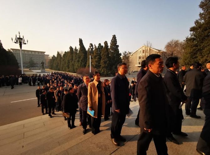 △上午八点半,正在陆续入场的学员们。在他们不远处屹立着毛泽东雕像。(央视记者张晓鹏拍摄)