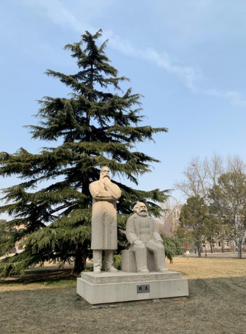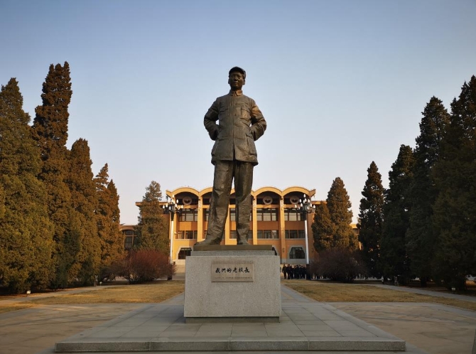 △礼堂前的毛泽东雕像。毛泽东曾在1943年到1947年间担任中共中央党校校长。(央视记者张晓鹏拍摄)
