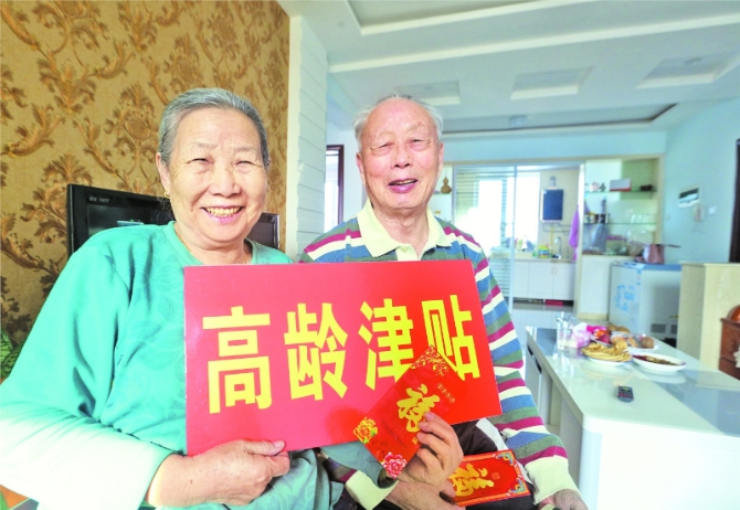 2月14日,博乐市南城区街道滨河社区居民夏少华(左)和卢宏华夫妇领到了高龄津贴。2018年,博乐市为2028名80岁以上老年人发放高龄津贴129.91万元。博州记者站 于苏甫·艾尼摄