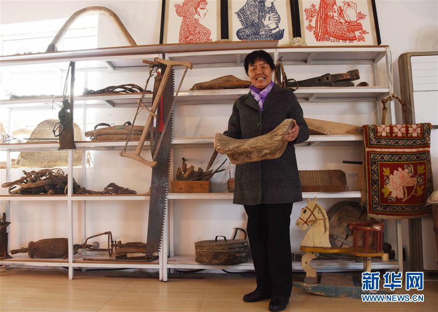 在阿勒泰市红墩镇“户儿家”民俗陈列馆,李红秀展示藏品(3月1日摄)。64岁的农民李红秀是新疆阿勒泰市民间博物馆创建者之一,由她建立的民俗陈列馆记载了“户儿家”百年传奇。新华社 记者张晓龙/摄