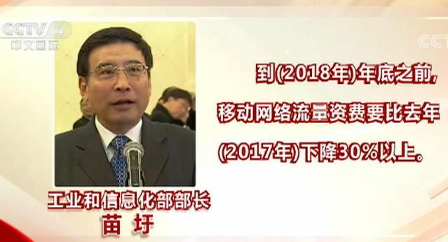 2018年3月5日的两会“部长通道”上,工业和信息化部部长苗圩表示,到(2018年)年底之前,移动网络流量资费要比去年(2017年)下降30%以上。