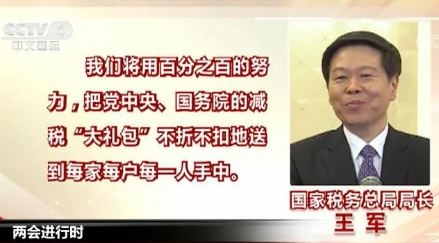 在2018年3月13日的两会部长通道上,国家税务总局局长王军表示,我们将用百分之百的努力,把党中央、国务院的减税“大礼包”不折不扣地送到每家每户每一人手中。
