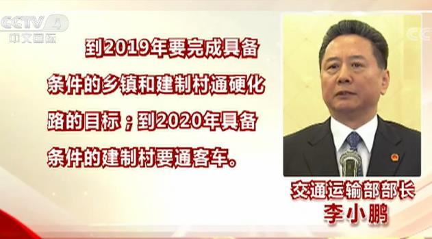 在2018年3月5日的两会“部长通道”上,交通运输部部长李小鹏表示,到2019年要完成具备条件的乡镇和建制村通硬化路的目标,到2020年具备条件的建制村要通客车。