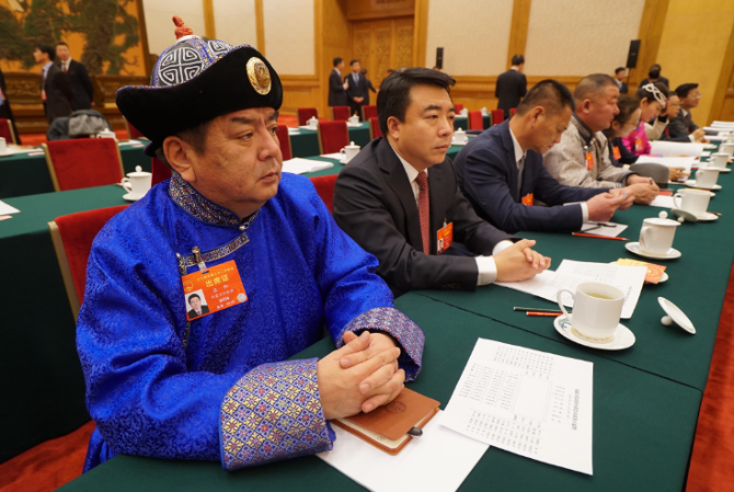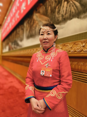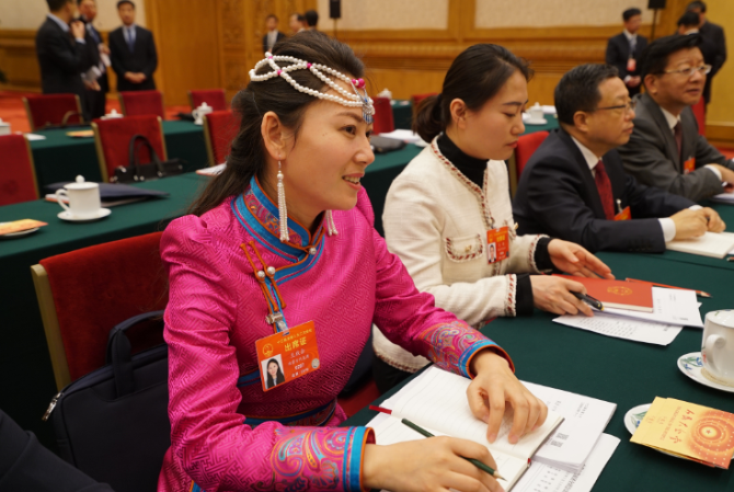 习近平走进会场后,鄂温克族代表梅花向他献上了蓝色的哈达。这是梅花代表。(央视记者张晓鹏拍摄)