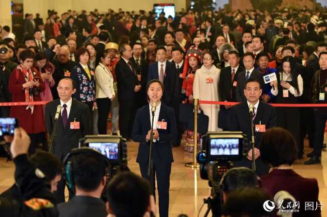 3月5日上午8:05,十三届全国人民代表大会第二次会议在人民大会堂举行首场“代表通道”。在首场“代表通道”中,8位全国人大代表接受了记者采访。(人民网记者 翁奇羽 摄)