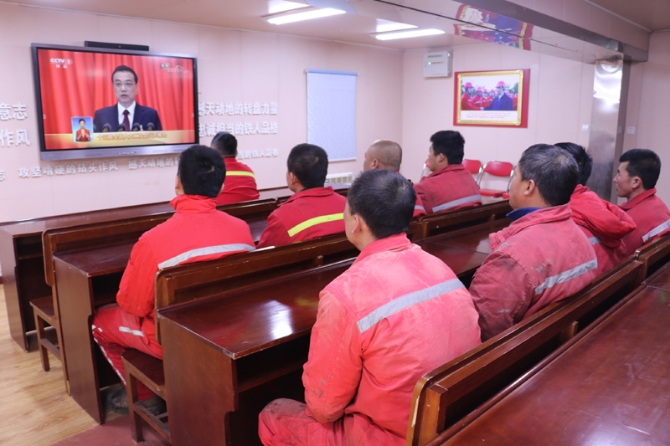 中国海油中海油服深圳分公司一线员工工作间隙通过手机直播收听政府工作报告