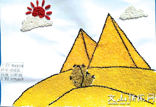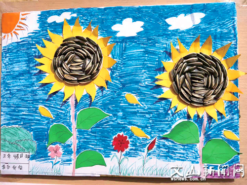 “我做的是一幅用开心果壳、绿豆、瓜子壳拼成的画,我之前在电视上看到过,这次寒假作业就做了,是在爸爸妈妈的帮助下完成的,很有成就感。”