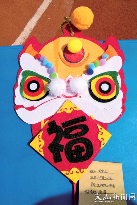 “我做的是用红包拼成的灯笼,因为过年收到了红包,灯笼也是非常喜庆,就和爸爸妈妈一起完成了。”