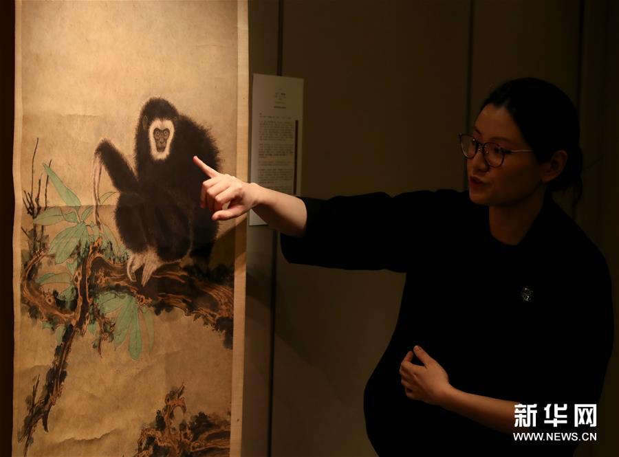3月7日,工作人员介绍张大千的《老树清猿》。 新华社记者李钢/摄