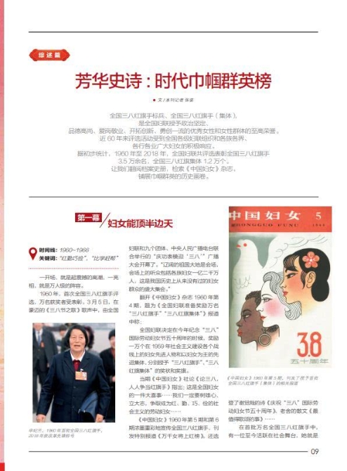 据初步统计,1960年至2018年,全国妇联共评选表彰全国三八红旗手3.5万余名,全国三八红旗集体1.2万个。全国三八红旗手(集体)这一全国妇联的闪光品牌,时代优秀女性和女性群体的最高荣誉,已经伴随中国妇女走过近60年,一代代全国三八红旗手,是历史长河中壮丽“半边天”的缩影,引领中国妇女建功立业,为实现民族复兴的磅礴伟业奋斗追梦。