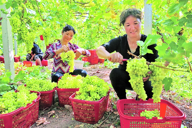 2018年8月7日,吐鲁番市高昌区亚尔镇英买里村村民在采摘葡萄。甄世新/摄