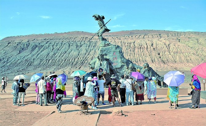 2018年8月20日,游客在吐鲁番火焰山景区游览。汤永/摄