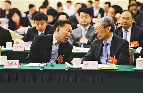 3月10日,人大山东代表团举行全体会议。全国人大代表王修林与同团代表程林就科研经费“包干制”等话题交流。经济日报-中国经济网记者 李景录摄