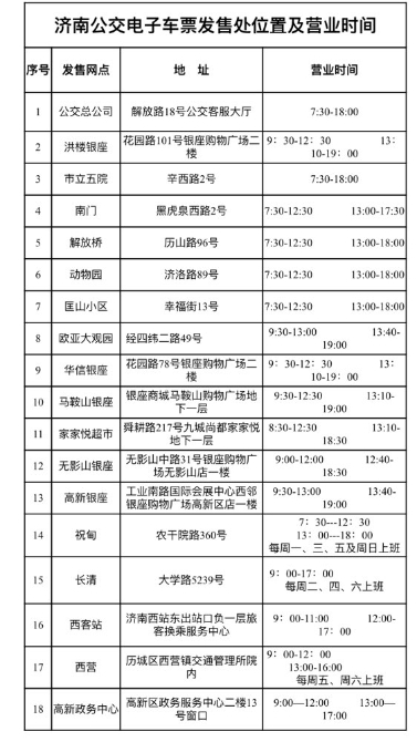 附:济南公交电子车票发售处位置及营业时间
