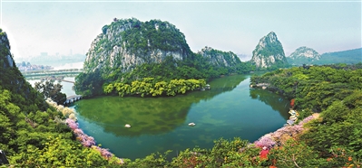宫粉紫荆带就在七星岩玉屏岩山脚,延绵近十里,与七星岩的山水形成绝美的景观。烟雨朦胧,雨雾中的紫荆更有风韵。迎着春日里的醉人烟雨,走在繁花满枝头的宫粉紫荆树下,踩着遍地坠落的粉红花瓣,四周弥漫着淡淡的花香,远处的湖山已模糊不辨,只有近身的宫粉紫荆让你感觉真实。