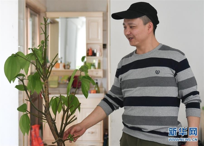 乌鲁木齐市天山区黑甲山片区阳光雅居居民马彦龙在新家整理盆栽(3月12日摄)。新华社 记者王菲/摄