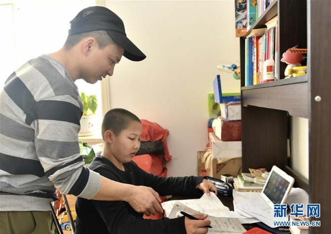 乌鲁木齐市天山区黑甲山片区阳光雅居居民马彦龙在新家辅导儿子写作业(3月12日摄)。新华社 记者王菲/摄