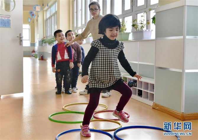 在位于黑甲山棚户区改造片区的乌鲁木齐市第二十幼儿园,小朋友和老师一起做游戏(3月12日摄)。 新华社 记者王菲/摄