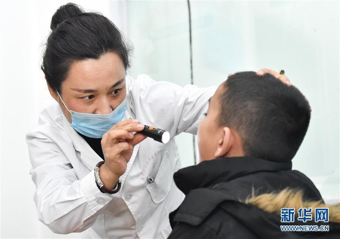 在乌鲁木齐市天山区黑甲山社区卫生服务中心,医生张伟正在给一名患儿看病(3月12日摄)。新华社 记者王菲/摄