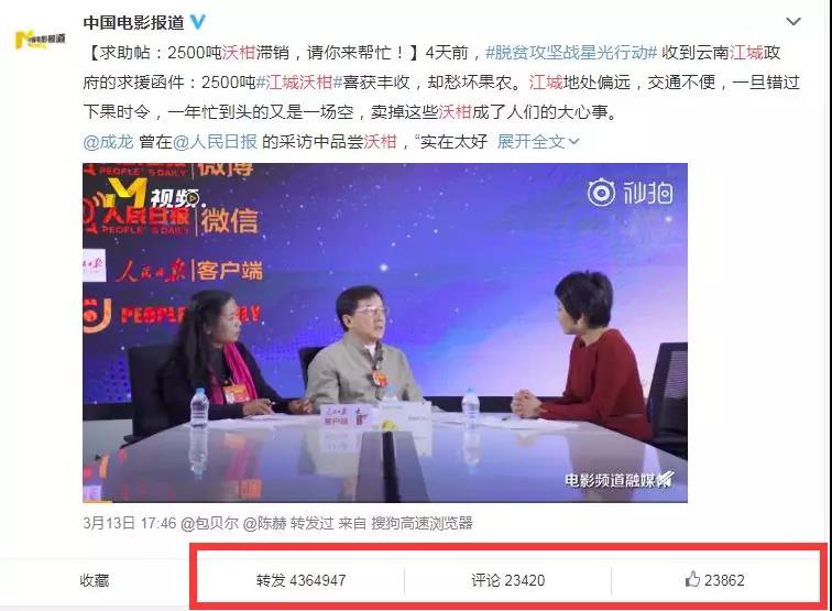 截至目前,已有142位明星电影人助力江城沃柑走出大山。