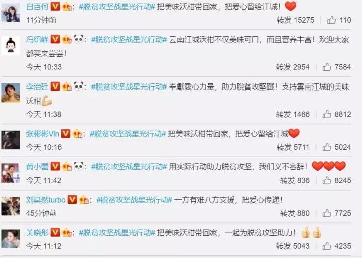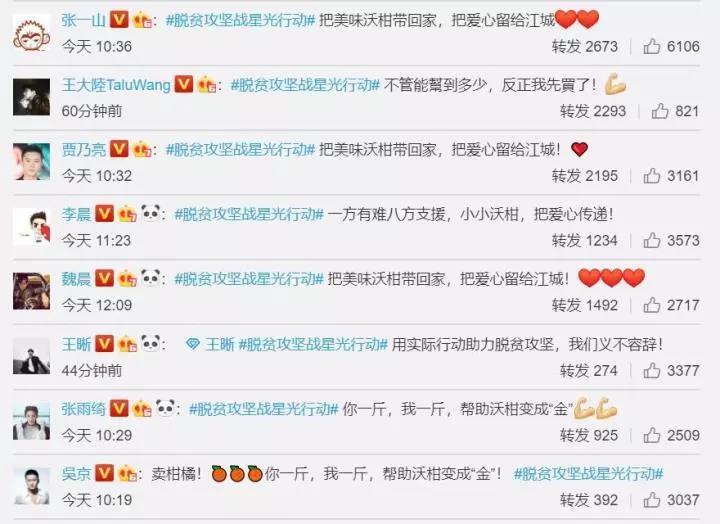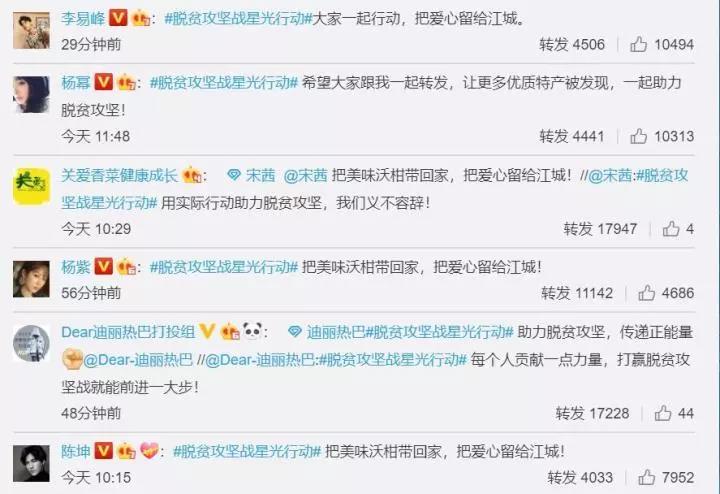此外,陈坤、杨紫、白百何、张彬彬、张一山、贾乃亮等明星也纷纷转发此消息,并发文:“把美味沃柑带回家,把爱心留给江城!”