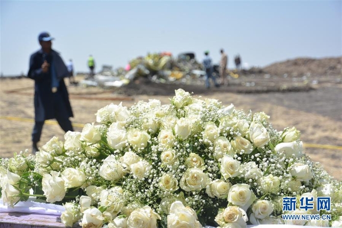 3月13日,鲜花摆放在埃塞俄比亚首都亚的斯亚贝巴附近的坠机现场。 10日,埃塞俄比亚航空公司一架计划从埃塞俄比亚首都亚的斯亚贝巴飞往肯尼亚首都内罗毕的客机在埃塞俄比亚境内坠毁,机上157名乘客和机组人员全部遇难。新华社发 奈尔维什/摄