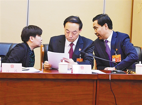 3月14日上午,人大青海代表团会议结束后,全国人大代表沙沨、张晓容、孟海(从左至右)就外商投资法草案进一步交流。 经济日报-中国经济网记者 李景录摄