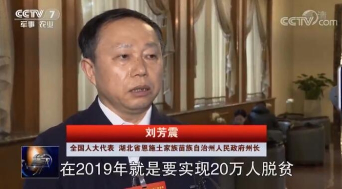 全国人大代表、湖北省恩施土家族苗族自治州人民政府州长 刘芳震:在2019年就是要实现20万人脱贫,所有的县市摘帽。我们一定会实现我们今年整体脱贫摘帽的目标。
