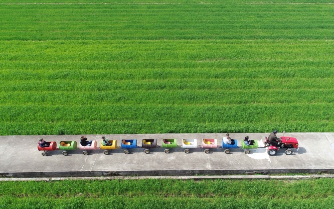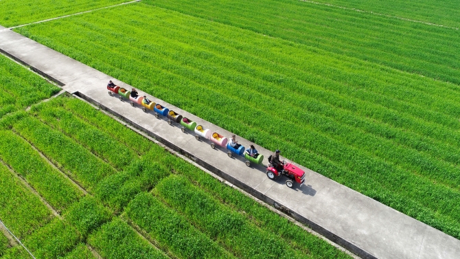 ↑3月17日,游客在清凉峰镇杨溪村内乘坐特色游览车观赏春日美景(无人机拍摄)。