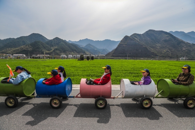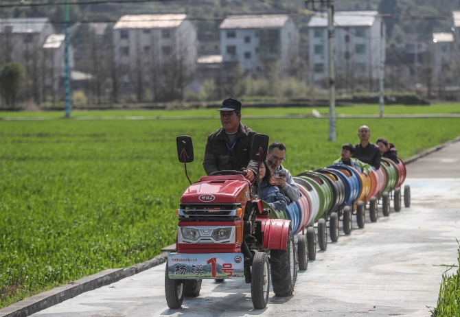 ↑3月17日,游客在清凉峰镇杨溪村内乘坐特色游览车观赏春日美景。