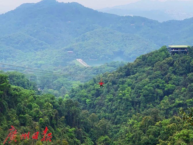 但滑索滑行相当平稳,记者也逐渐适应,记者只需举起双手抓好头顶的扶杆,就能安心的欣赏脚下和远处的风景。白云山葱葱绿树、高低起伏的山峦美景,可谓尽收眼底。