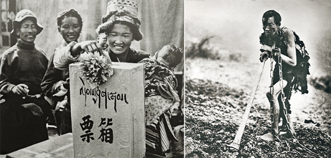 西藏民主改革前,农奴只不过是“会说话的工具”。西藏民主改革彻底废除了封建农奴制度,开启了西藏从黑暗走向光明、从落后走向进步的新时代,农奴成为掌握自己命运的主人。1961年,西藏各地开始实行普选,1965年8月,西藏乡县选举工作完成。左图为西藏民主改革后翻身农奴怀着喜悦的心情选举自己的当家人(汉图/视觉中国)。右图为西藏民主改革前戴着锁链劳动的农奴(新华社发)。