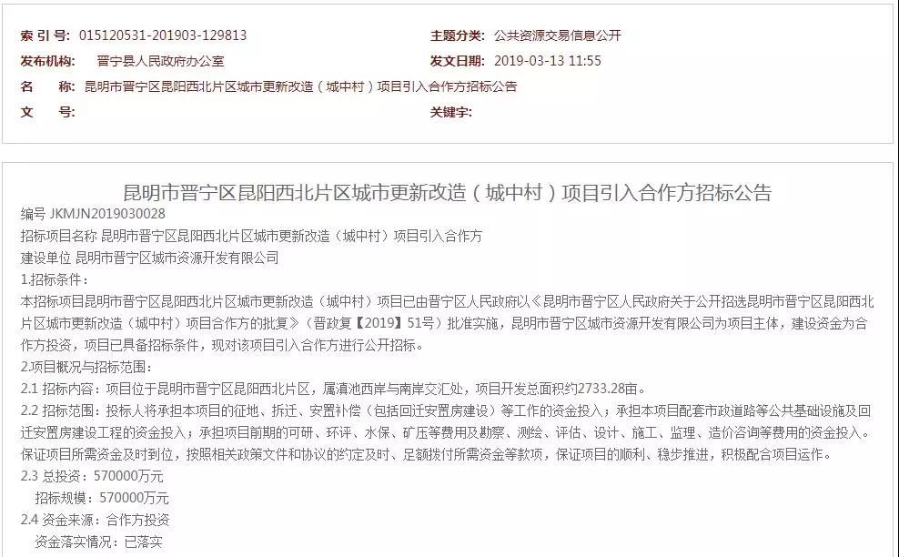 昆明信息港综合 近日,晋宁县人民政府网近日发布了晋宁区昆阳西北片区城市更新改造(城中村)项目引入合作方招标公告。根据公告显示,此次晋宁城改项目总投资57亿,开发总面积约2733.28亩,城改范围在晋宁区昆阳西北片区,属滇池西岸与南岸交汇处。