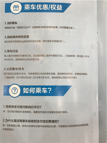 礼包二:2019年4月5日——2019年4月30日,昆明公交支付宝乘车码(昆明云公交卡)推出6折周期卡体验活动。