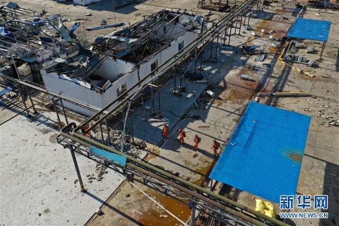 3月22日,消防队员在江苏盐城响水化工厂爆炸事故现场搜救(无人机拍摄)。 新华社记者 季春鹏/摄