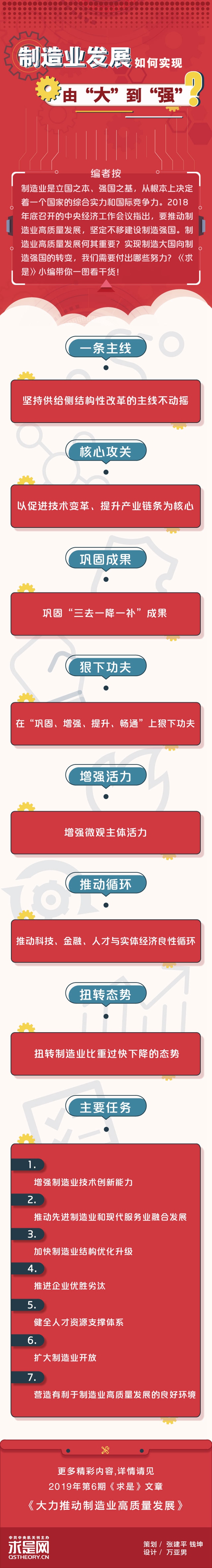 编者按:制造业是立国之本、强国之基,从根本上决定着一个国家的综合实力和国际竞争力。2018年底召开的中央经济工作会议指出,要推动制造业高质量发展,坚定不移建设制造强国。制造业高质量发展何其重要?实现制造大国向制造强国的转变,我们需要付出哪些努力?《求是》小编带你一图看干货!