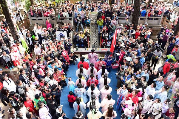 昆明信息港讯 记者杨雁 3月23日,来到昆明市金殿名胜区的游客会有种错觉,感觉自己穿越了时空。金殿铜殿旁的紫薇广场成了汉文化集市,身着各式汉服的美丽“小姐姐”们在集市上挑选着头饰,一些女子则在长廊里梳理妆容,她们在等待一场花朝盛会的举办。当天,2000多名身着汉服的青年男女来到金殿,共同参加一年一度花朝春祭仪式,曲水流觞,才艺竞技,再现汉文化民俗传统。