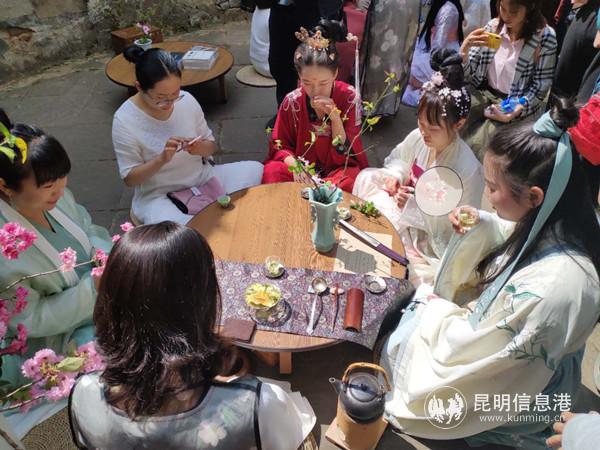 当天,所有着传统汉服入园者均得到免票入园的优惠。汉文化集市上最为热闹,精美的头饰和发饰,扇子、手绘山茶花丝巾等手作工艺品销售,汉服妆造服务、汉服租借服务,云南汉服绣花鞋销售,手作粉黛、口红销售等一应俱全,汉服女子们挑选着精美的饰品,装扮美丽容貌。热闹的集市上穿梭着汉服男女们的身影,让人感觉穿越了时空,宛若回到了古代花朝节,游客们与穿着汉服的“花仙子”们一起游园,亲身感受花朝节及汉文化的独特魅力。