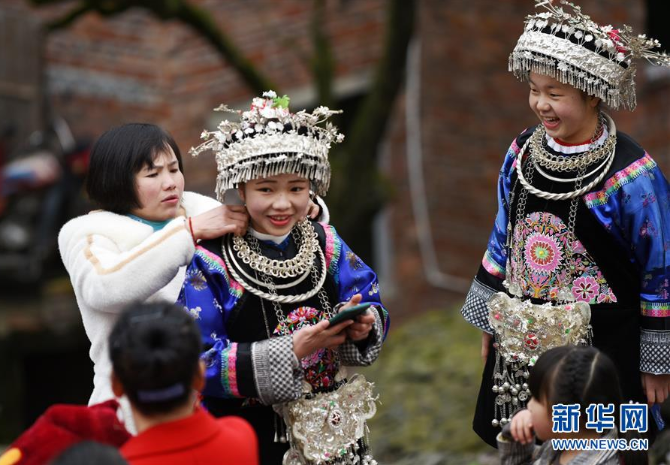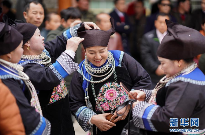 3月23日,一名妇女帮助同伴整理头饰。 连日来,在贵州省剑河县岑松镇岑松社区对门寨,来自周边村寨的少数民族群众欢聚一堂,通过跳芦笙舞、对情歌、唱苗族古歌等方式,欢度民族芦笙歌舞文化节。新华社记者杨文斌摄