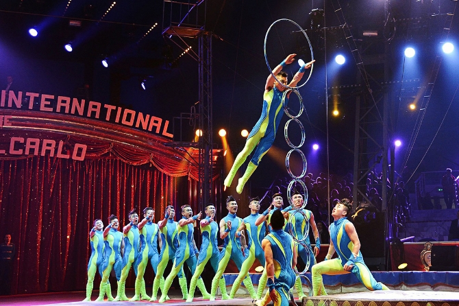 △中国杂技演员在蒙特卡洛国际杂技节上表演。蒙特卡洛杂技节是规模最大、水平最高的国际杂技节之一。自1982年起,中国每年派杂技团参赛,并多次夺得最高奖项“金小丑”奖。