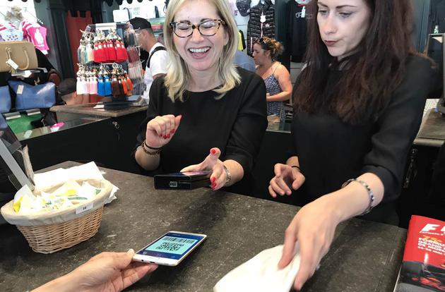 △中国游客正在摩纳哥使用支付宝购物。