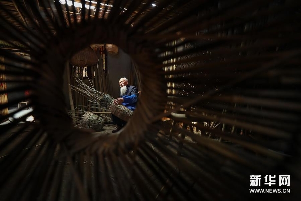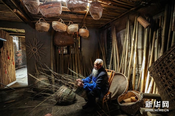 3月20日,72岁的罗朝荣在彭镇老街的竹编坊内编竹篓。