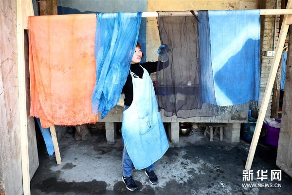 3月20日,工作人员在彭镇老街晾晒染好的织物。