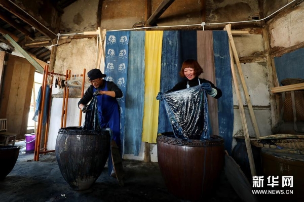 3月20日,工作人员在彭镇老街展示手工染布。
