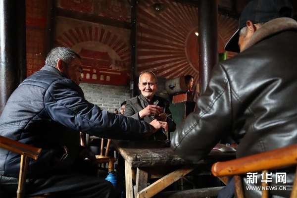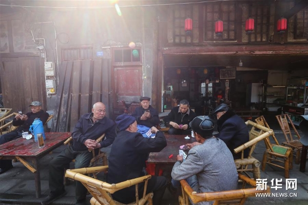 3月20日,老茶客们在彭镇老茶馆内喝茶打牌。