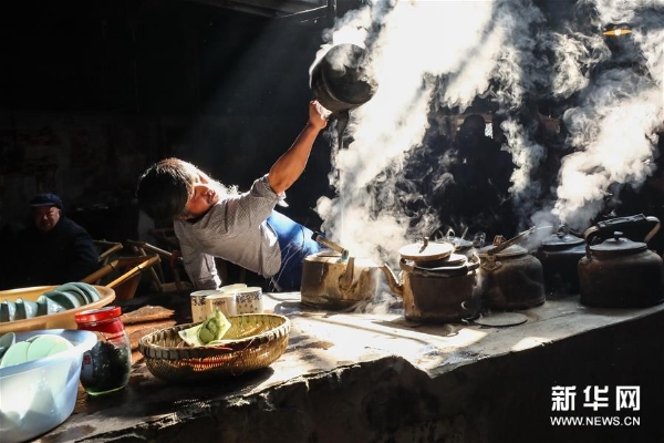 3月20日,彭镇老茶馆的服务员在表演沏茶。