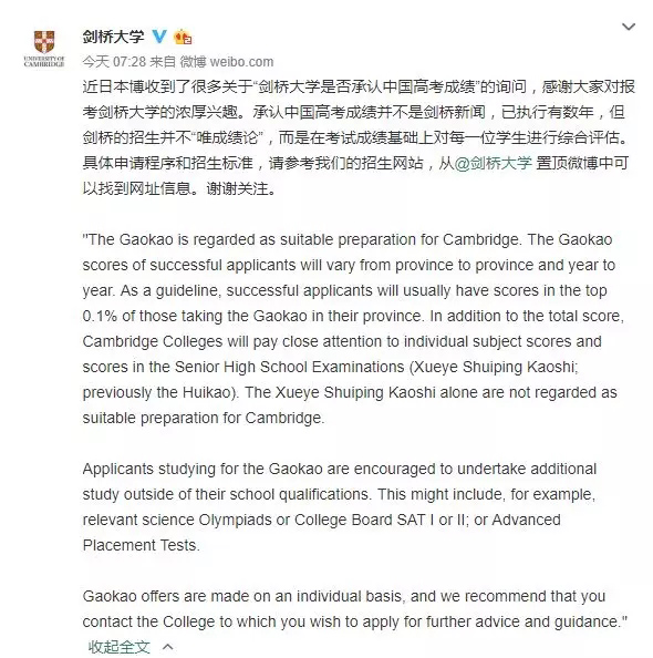 刚刚,剑桥大学这样回应“承认中国高考成绩”