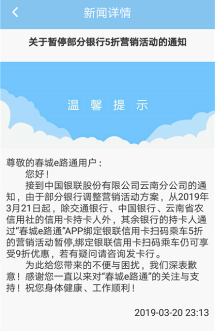 “怎么我的银联信用卡扫码乘公交车不能享受5折优惠?”连日来,不断有市民这样反映,用银联信用卡扫码乘公交车没有优惠。昆明公交集团相关人士介绍,昆明公交集团已接到中国银联股份有限公司云南分公司通知,由于部分银行调整营销活动方案,从3月21日起,除交通银行、中国银行、云南省农村信用社的信用卡持卡人外,其余银行均银联信用卡扫码乘公交车5折的营销活动。持卡人通过“春城e路通”App绑定银联信用卡扫码乘公交车的,仍可享受9折优惠。