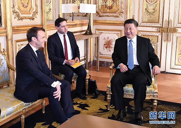 习近平指出,中国和欧盟是当今世界两大力量、两大市场、两大文明。中国重视欧洲战略地位和作用,一直将深化对欧关系作为外交优先方向。中方支持法方在欧洲联合自强进程中继续发挥引领作用。希望法方推动欧盟在发展对华关系方面发挥更积极影响。希望双方加快推进中欧投资协定谈判,尽早启动中欧自由贸易区联合可行性研究。